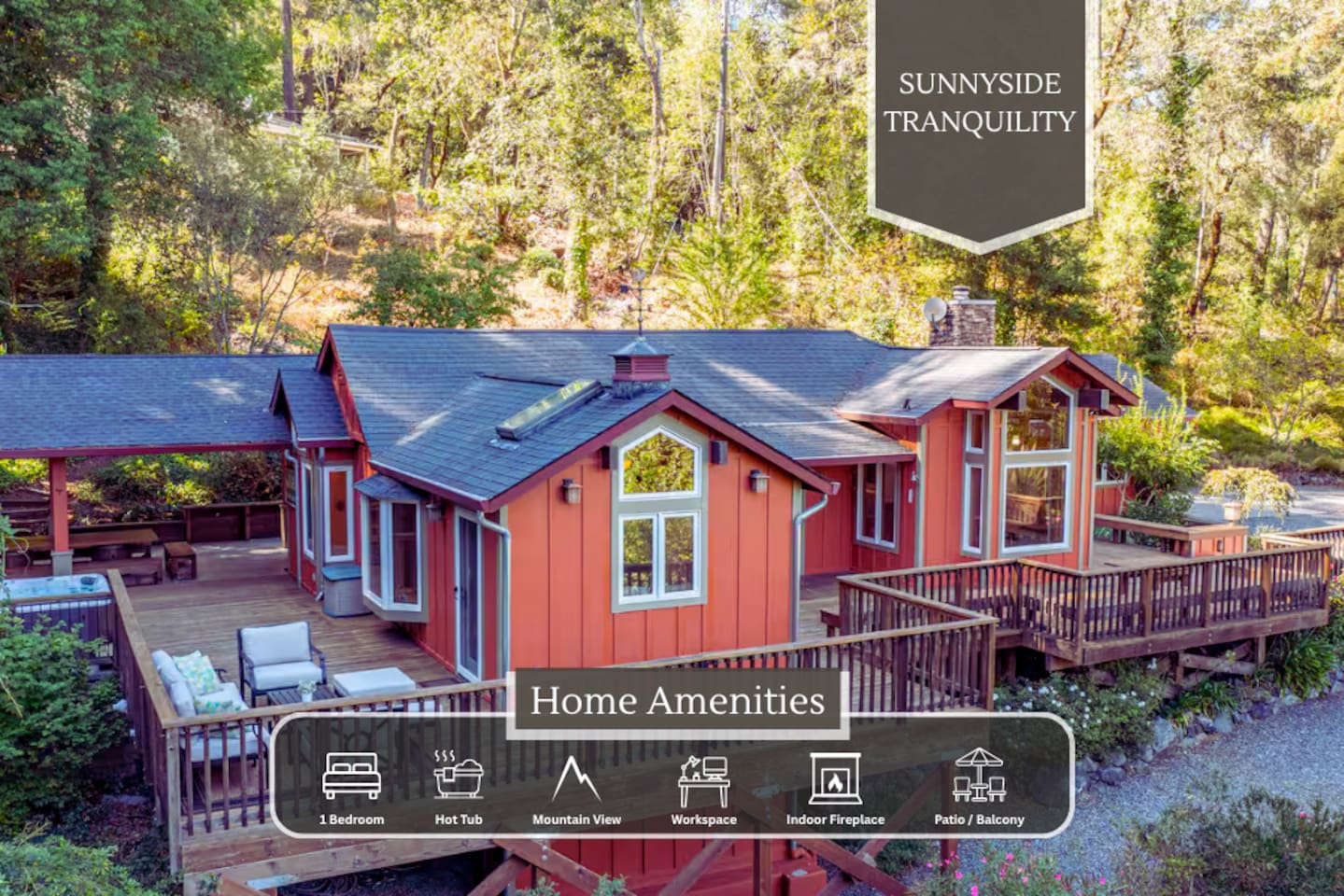 Located on a private, sun-drenched 1.3-acre lot surrounded by majestic redwoods, this 1,400 sq ft home provides amazing views from every room, beautiful vaulted wood ceilings, and high-end finishes. Enjoy the wonderful outdoor living spaces with hot tub, wrap around deck, lounge areas, BBQ, and a large covered outdoor dining area. Located in the heart of Russian River Valley wine country, the home is a short drive to many renowned wineries, and the Russian River.