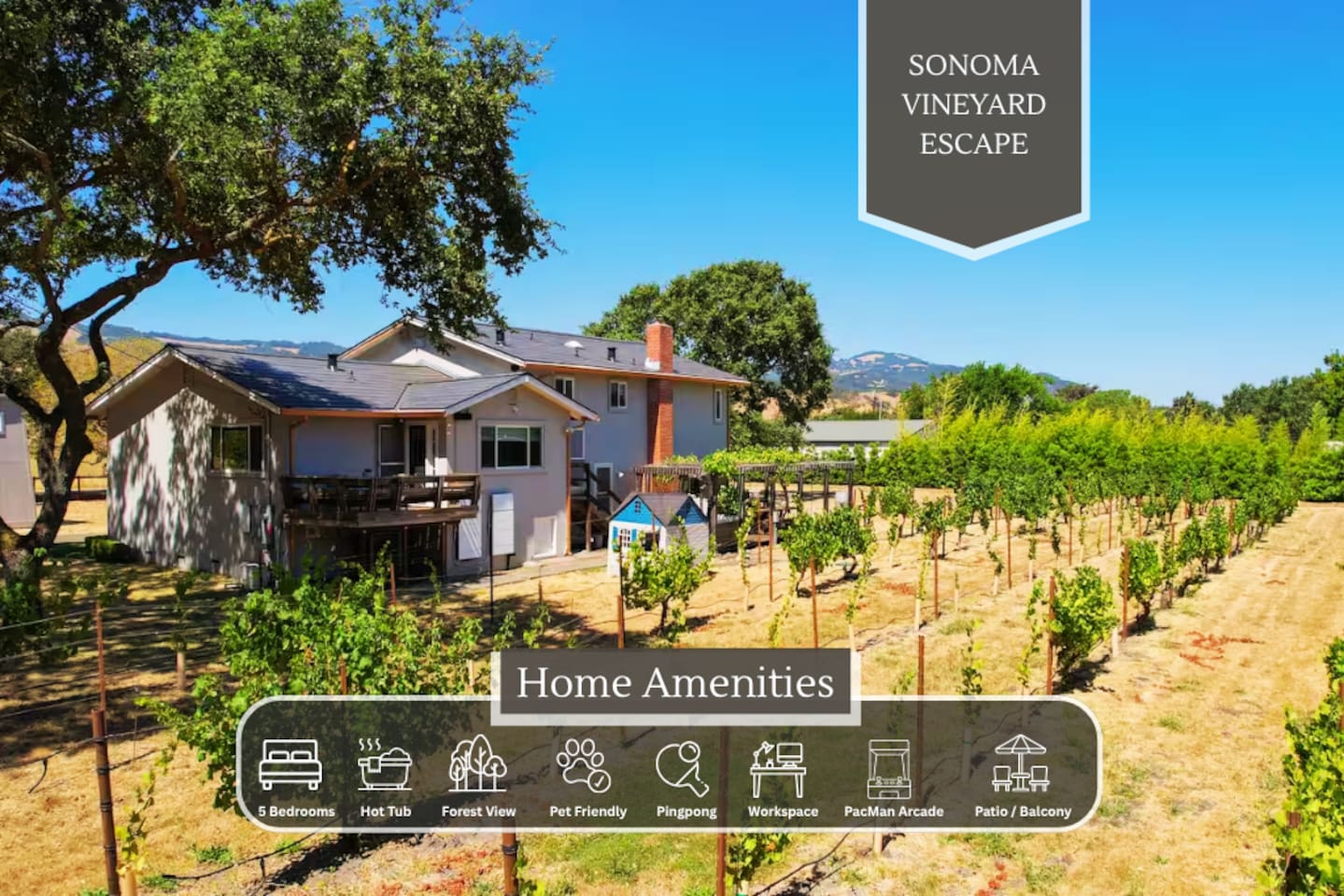 Recently renovated family friendly home in a beautiful setting conveniently located just minutes from the historic Sonoma Square. Tucked into a picturesque and quiet rural neighborhood this home boasts stunning views of surrounding vineyards, Felder Creek and the Sonoma hills. The perfect place for gathering with family and friends to enjoy a memorable wine country getaway.