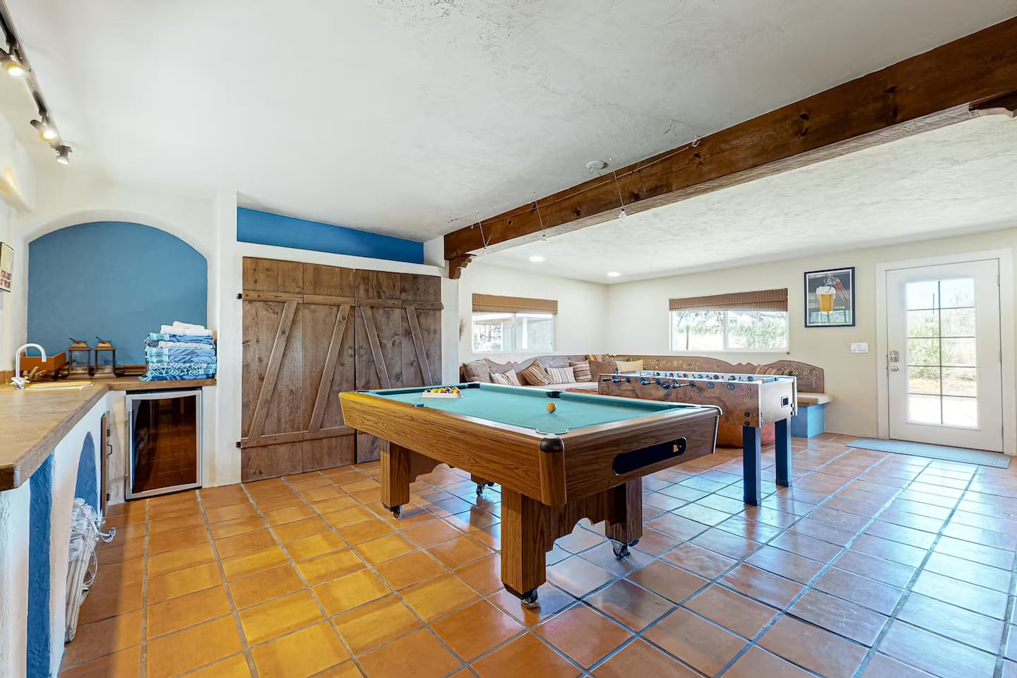 Relax in one of 3 living areas. The impeccably decorated main living room is designed to be a sanctuary of comfort and style with wonderful views of the pool, vineyards, and surrounding mountains. Unwind in the games room while playing a game of Pool or Foosball and watching TV. The third comfortable living space is located just off the patio, with French doors out to the pool. It has a queen-sized sleeper sofa to accommodate up to 8 guests.