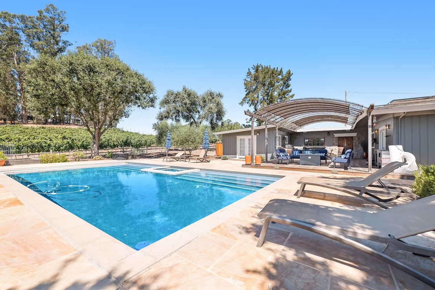 Escape to our luxurious Sonoma villa located just a 10-minute drive from Sonoma Square. As you step onto the property, you'll be greeted by the breathtaking vineyard surrounding the villa, setting the stage for a truly enchanting stay. This stunning property offers a truly unforgettable vacation experience with its expansive 5-acre grounds, 3 large bedrooms, 3 bathrooms (2 en-suite), a chef’s kitchen, a games room, a resort-like swimming pool (heating available for a fee), a hot tub, a fire pit, and a number of other amenities.