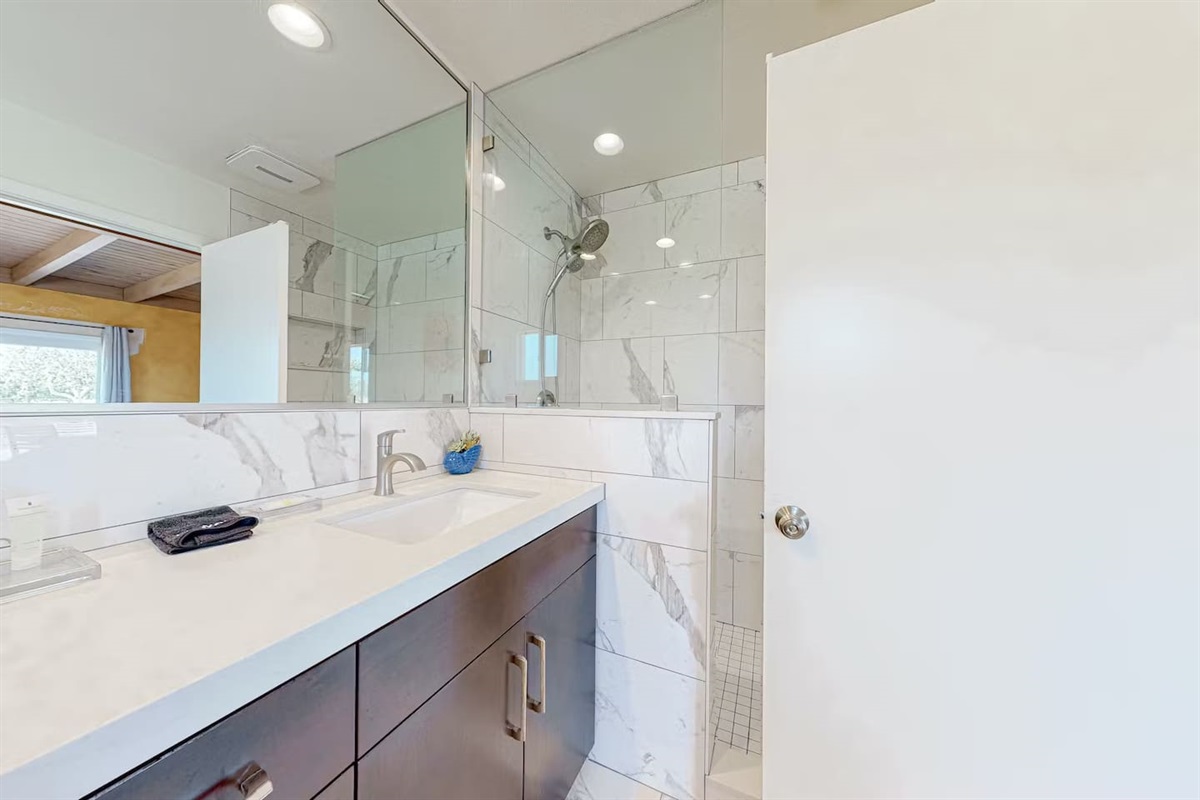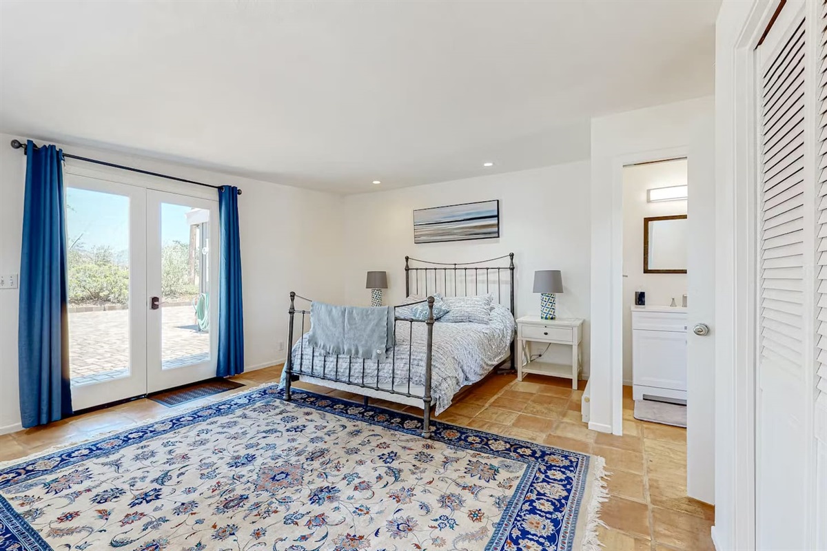 ✔ Bedroom 3 (accessed from the patio): Queen-size bed, ensuite bathroom (tub and shower combo), and direct patio access to the pool and hot tub.