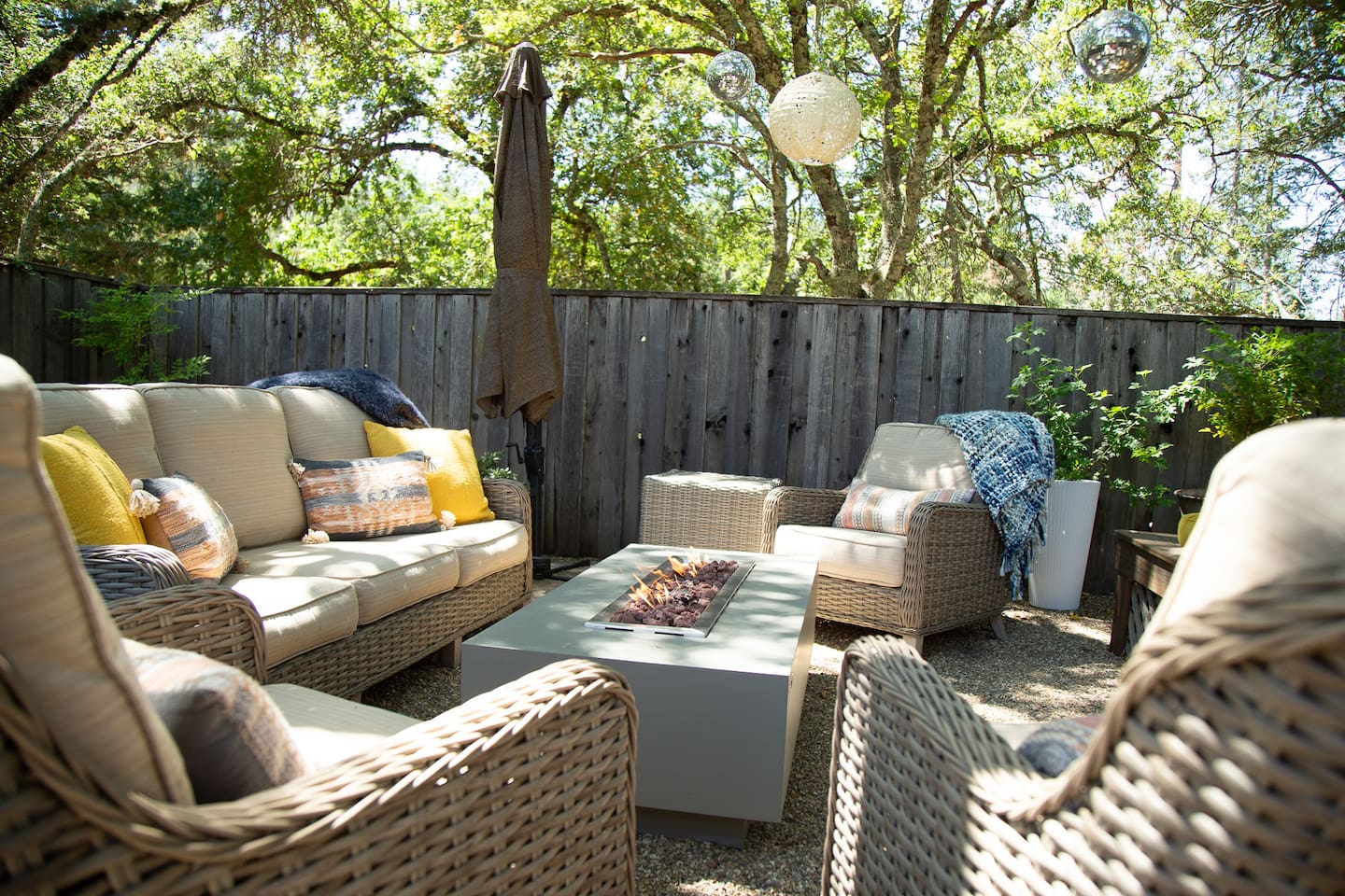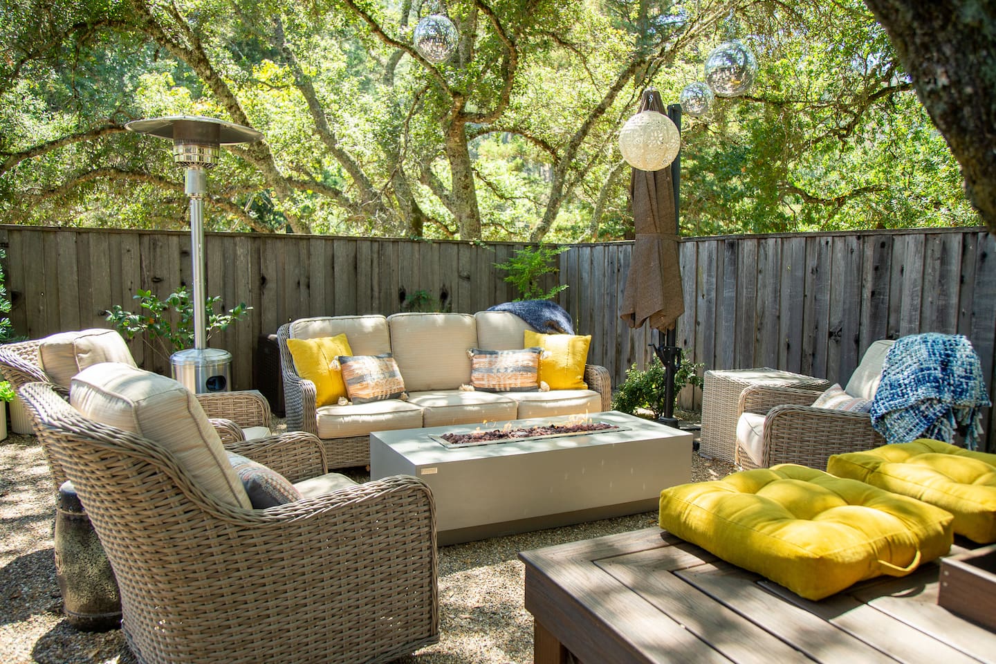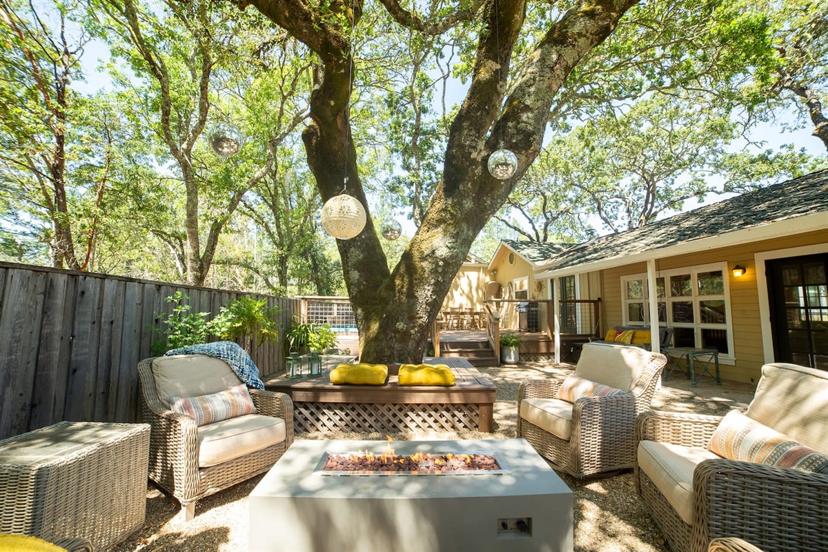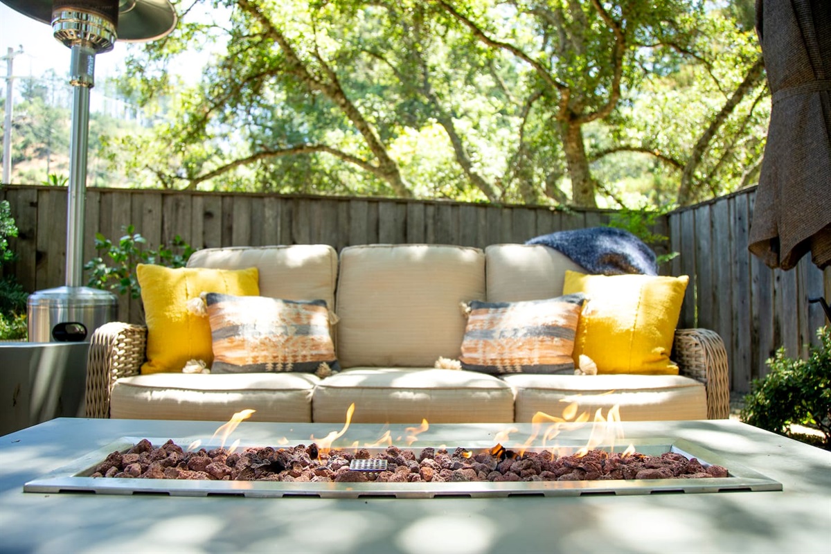 ✔ Fire Pit: Gather with friends, wine in hand, by the fire table at night.