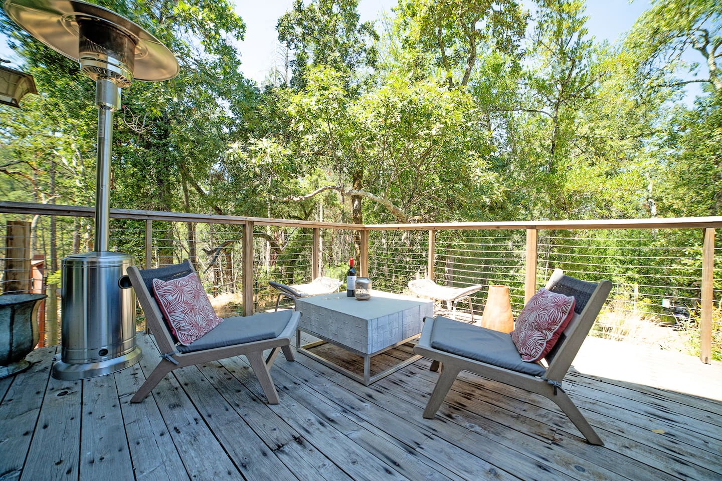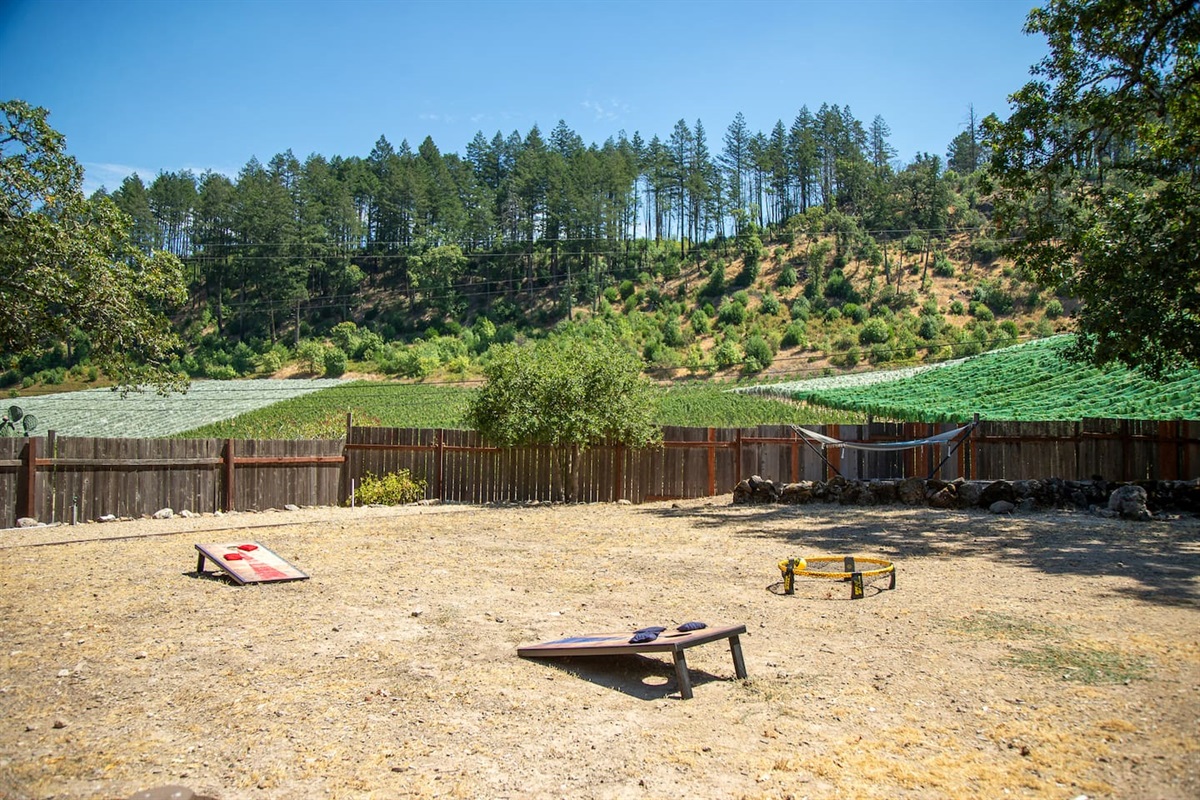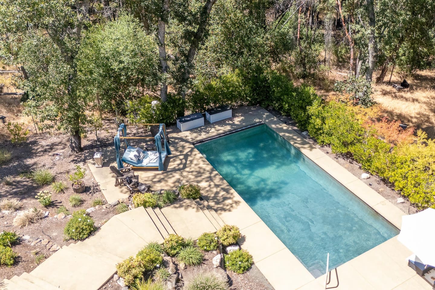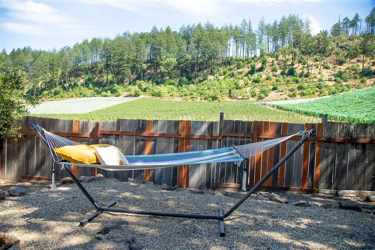 Enjoy outdoor living with vineyard and oak tree views. There is lots of outdoor space – enjoy a swim in the heated pool in the warmer months (pool heating can be purchased separately), or a game of cornhole. Have your breakfast or coffee in the front yard with vineyard views, or enjoy a lunch BBQ in the back. On warmer days, you can sunbathe or swim in the pool, or just take a nap on the hammock. Sit around the fire-table and night with your glass of wine and create new memories! The hot tub, is a welcome night-cap with uninterrupted views of the starry night sky.