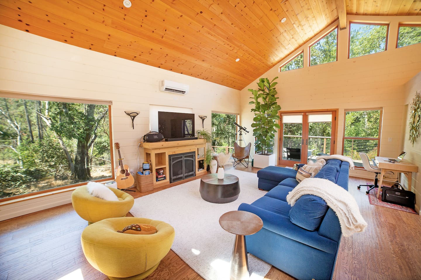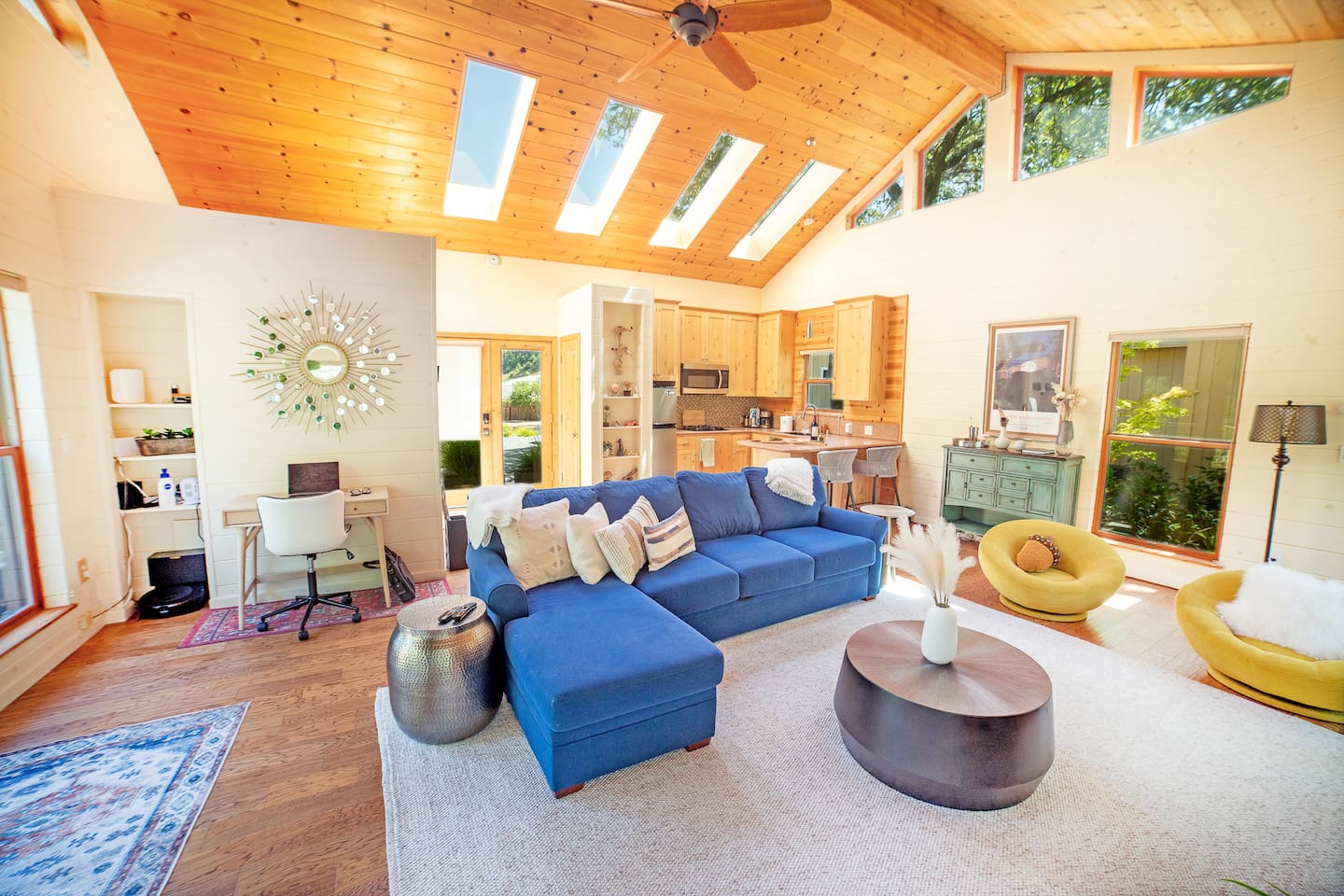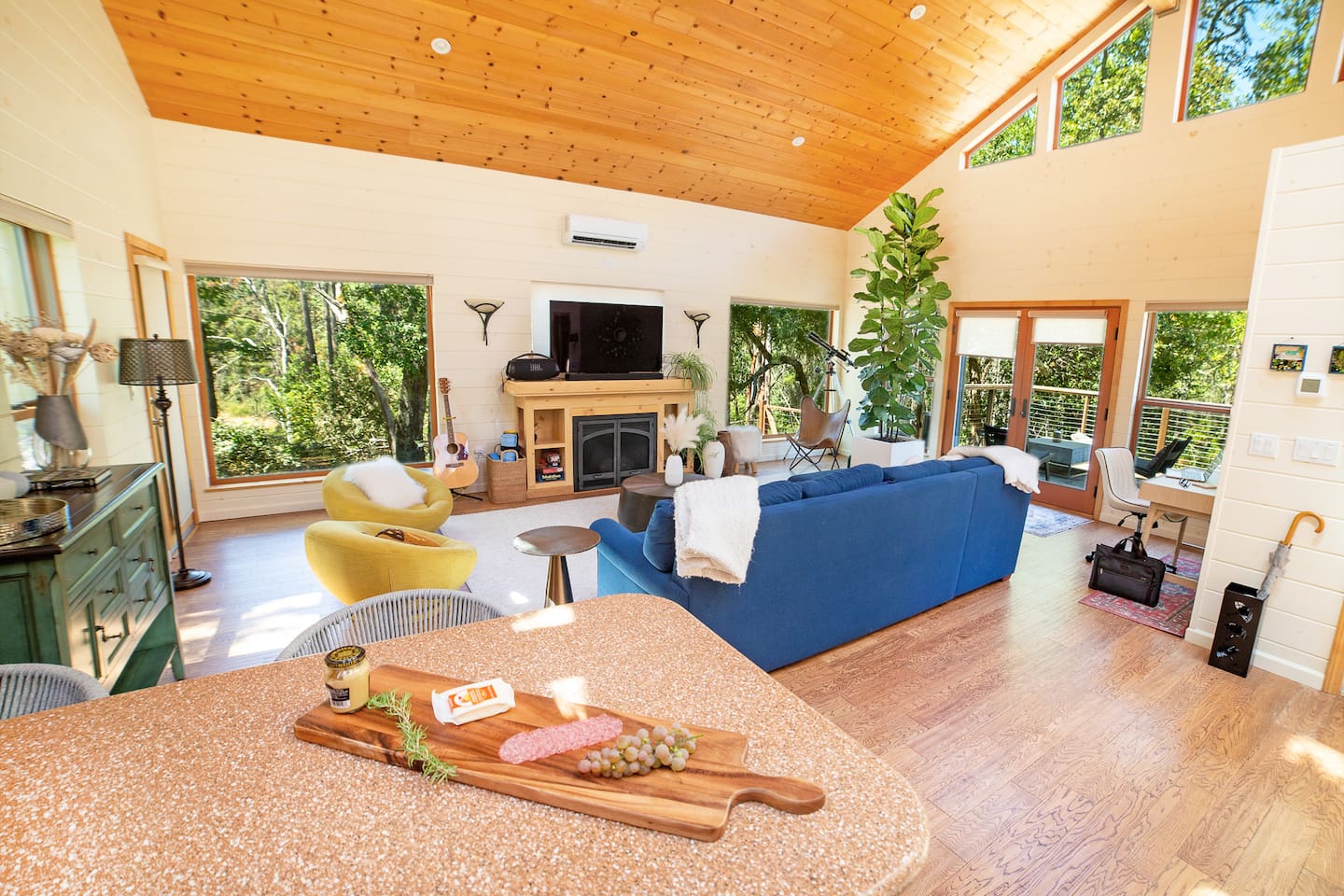 The home has two indoor living spaces – both featuring gas fireplaces for cozy evenings and air conditioning for hot summer days. The main living room offers comfortable seating for 6 around a gas fireplace, with plenty of light from the windows or French doors out to the back garden. It also has a dedicated work area with a large monitor and keyboard. The family room can also seat 6 guests and has a gas fireplace/air conditioning, and includes another work desk, a 55” TV, a large Bluetooth speaker, and a second kitchen area.
