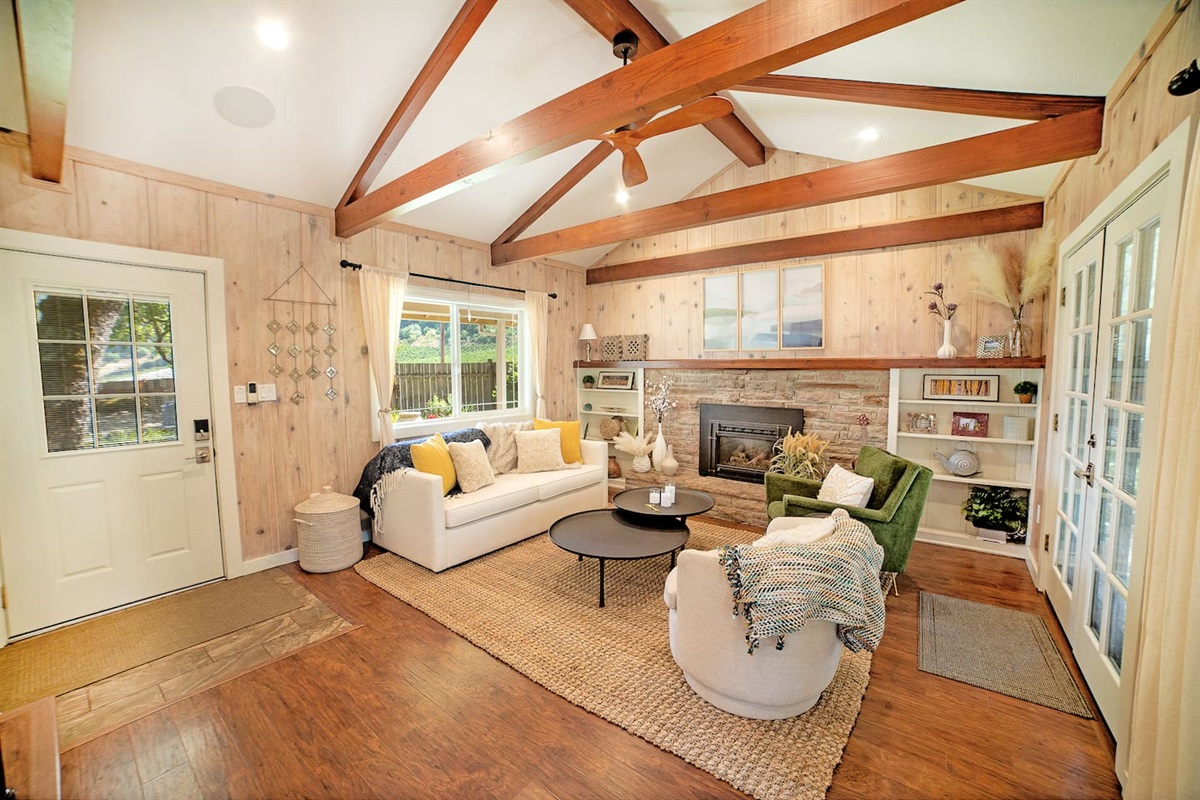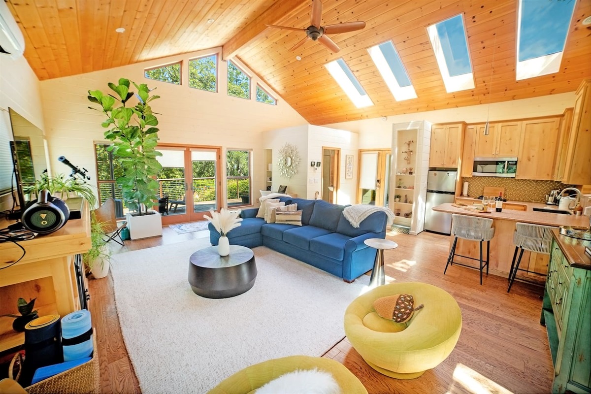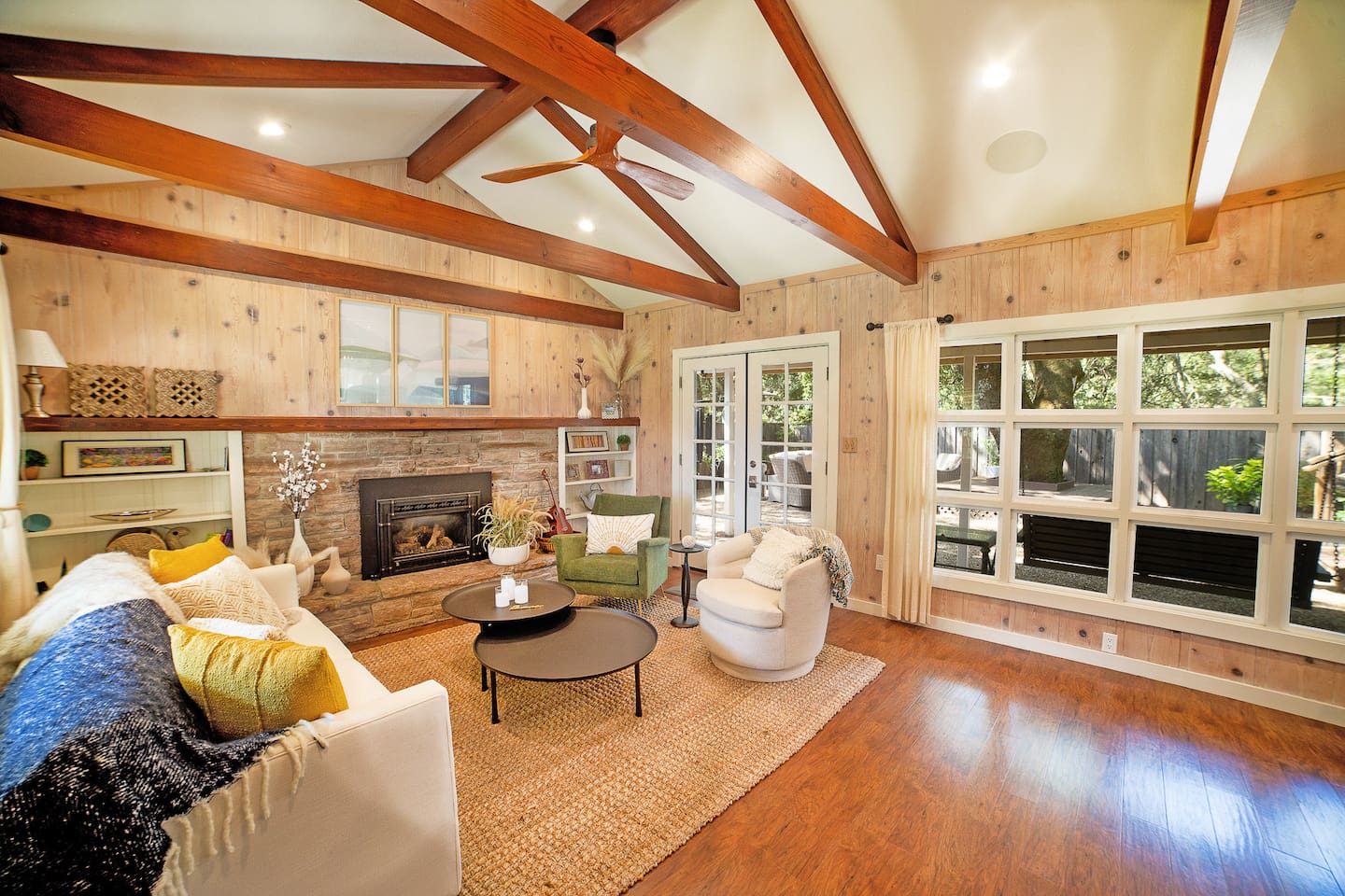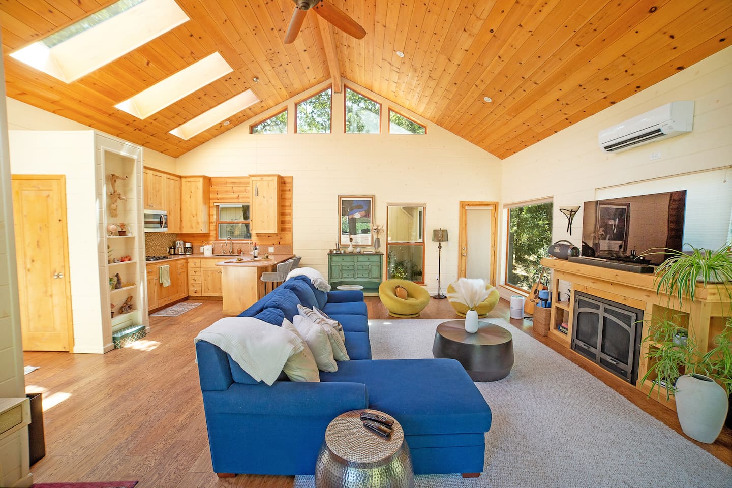 The home has two indoor living spaces – both featuring gas fireplaces for cozy evenings and air conditioning for hot summer days. The main living room offers comfortable seating for 6 around a gas fireplace, with plenty of light from the windows or French doors out to the back garden. It also has a dedicated work area with a large monitor and keyboard. The family room can also seat 6 guests and has a gas fireplace/air conditioning, and includes another work desk, a 55” TV, a large Bluetooth speaker, and a second kitchen area.