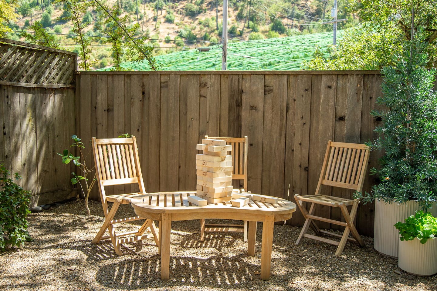 ✔ Games: Enjoy Jenga or corn hole along with other board games.