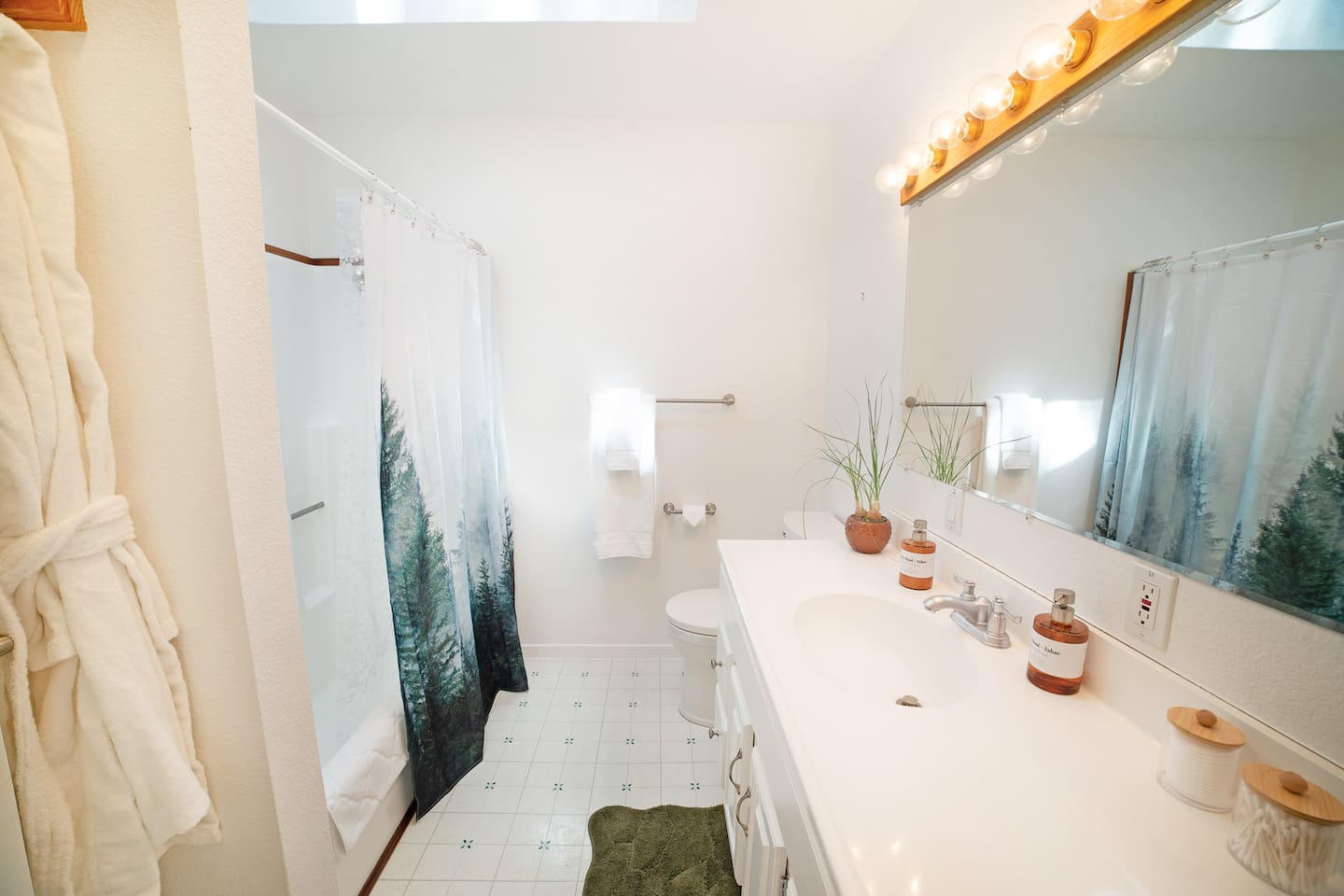 ✔ Bedroom 3: Bunk bed with a full bed below and twin bed above — en-suite bathroom with a shower over bathtub.