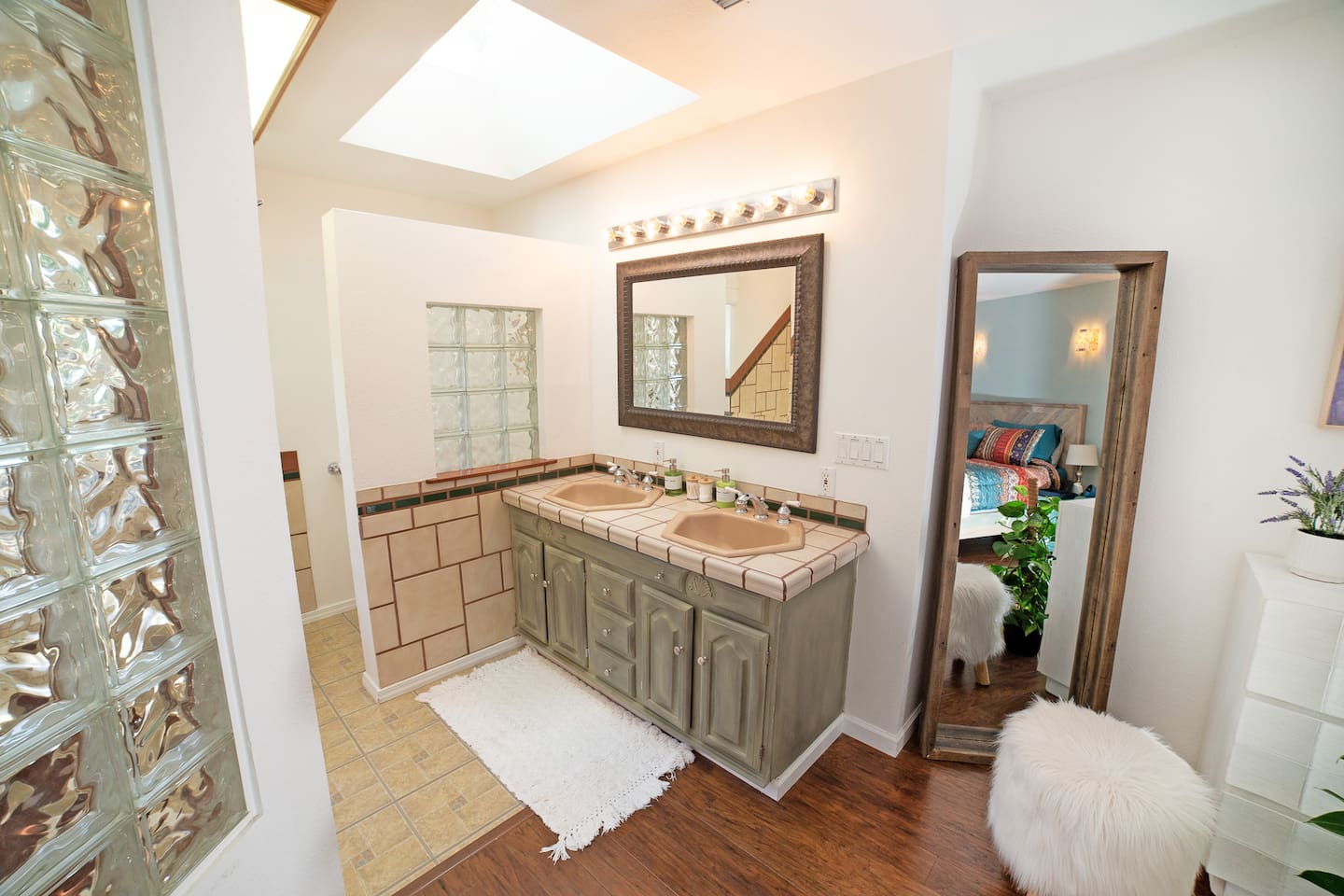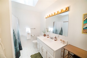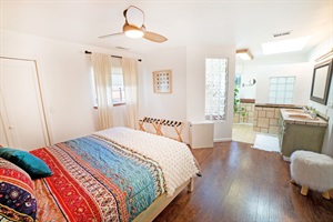 ✔ Primary Bedroom: Queen bed and connected en-suite bathroom with huge 2-person jacuzzi tub, separate shower, and double sink area.