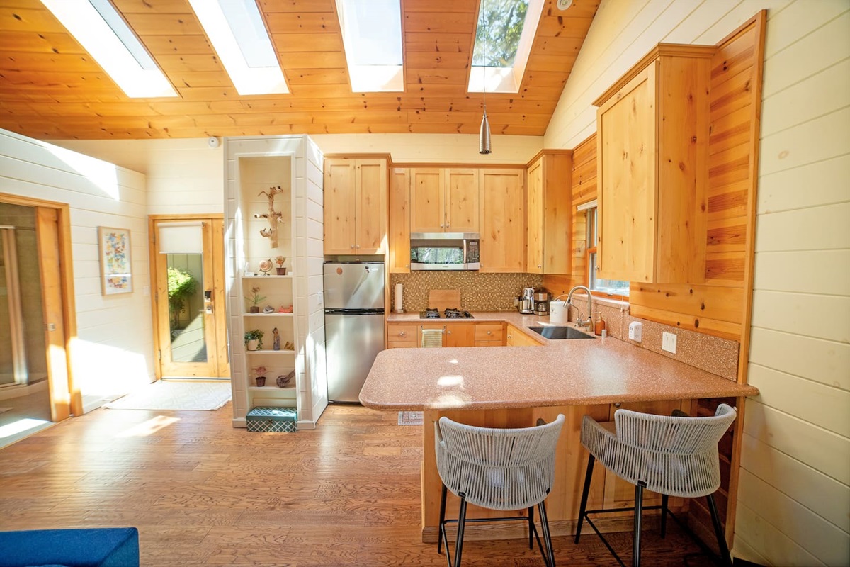 There are two kitchens at the house – one in the main house and one in the family room/studio. The central kitchen features a large smart fridge, a toaster oven, a microwave, and a dishwasher. The second kitchen has a refrigerator, a 4-burner gas stove, a microwave, and a dishwasher